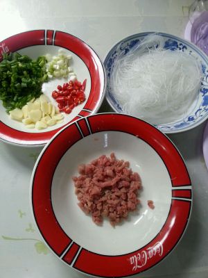 粉丝用热水提前泡软; 热锅冷油,爆香五香粉,放入肉末翻炒,放入葱姜蒜、干辣椒炒出香味;