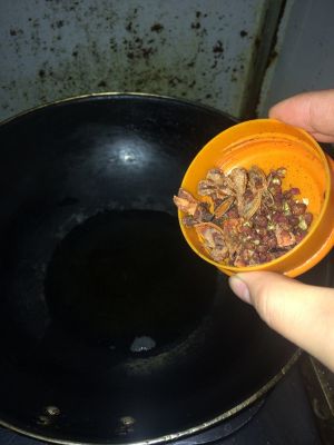 热锅凉油,放入八角和花椒,花椒我放的多,喜欢吃麻辣,八角放了五棵左右