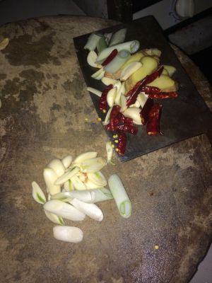 2将干红辣椒切碎,葱切段,姜切丝,蒜切片,花椒一汤匙备用。