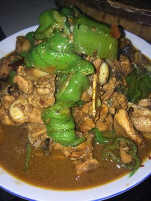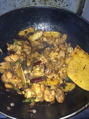 8然后锅中倒入炸好的鸡肉块一起翻炒片刻。(喜欢吃软一点的鸡丁的,可以加入热水稍煮一会)