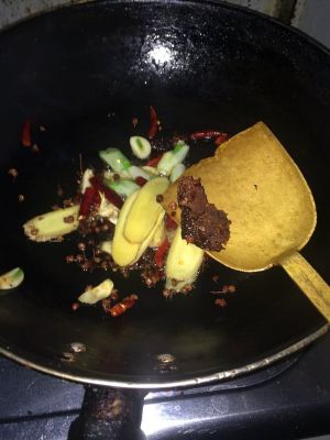 放完八角和花椒煸炒片刻放葱姜蒜辣椒,爆出香味放豆瓣酱继续煸炒,豆瓣酱要炒出香味才好吃哟