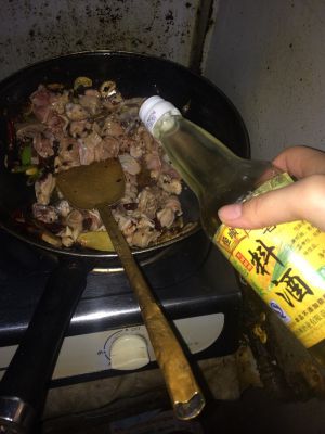 炒出香味放鸡啦,继续煸煸煸,一分钟后放入料酒,继续炒炒炒