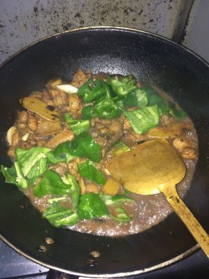 现在可以看到汤汁已经少了很多了把,放入青椒,再翻炒片刻