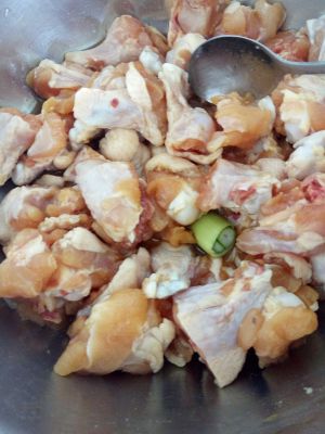 1将三黄鸡洗净,去头去爪,剁成3一4毫米左右的块,加入料酒,盐,葱姜,生抽,生粉拌匀腌制25分钟。