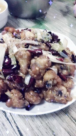 另锅,油热,葱姜蒜入干辣椒,花椒或麻椒,煸出香味,入鸡块翻炒,撒白芝麻,葱花出锅。2、3分钟即可,时间长,辣味会重些。