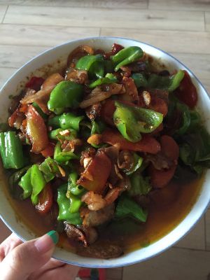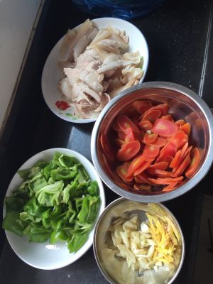 把五花肉 胡萝卜煮8成熟 煮好后切好 青椒 姜 蒜切好放好