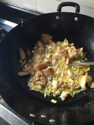 倒入适量酱油翻炒上色,再倒入小青椒翻炒一下,最后再倒入盐菜少许盐翻炒均匀即可(如果之前酱油较多就不要盐了)。