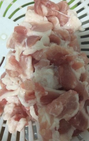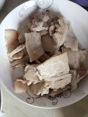 第一步: # 五花肉冷锅烧热烙烫肉皮焦而不糊 # 入冷水,加入姜片 花椒 料酒 烧开,肉煮熟不老除味。一根筷子刚好感觉脆脆的穿过肉便煮好了 # 煮好的肉捞起沥干水份凉一下肉好切 # 切肉成片,肉不上切,不下切,侧着切我觉得最好切,厚度一定要适中,厚则腻,薄则无 # 红萝卜切片焯水 蒜苗切斜段 备用