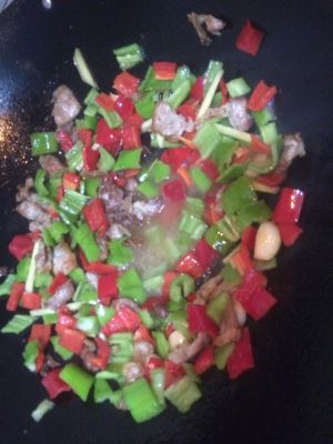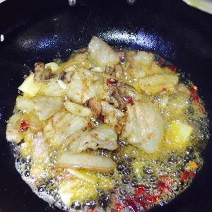 炒香后加入老姜,蒜,干辣椒段白糖,一起炒香。