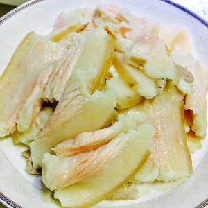 五花肉加料酒,葱和姜片小火煮十分钟左右,然后捞起冷却切片