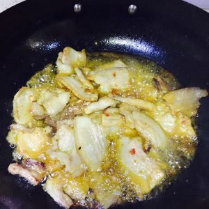 锅热后油倒入锅里,油温够后,把肉还有干花椒一起倒入锅里,一直用大火爆炒。爆至肉片卷曲,熬出猪油,表面微黄。在锅中间露出油,加入豆瓣酱,炒香后和肉片混合翻炒。
