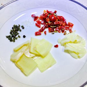 老姜切片,蒜拍烂,干青花椒,干辣椒段,白糖一旁备用