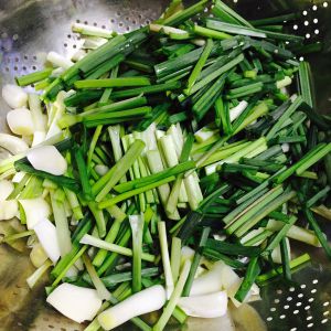 加入藠头一起翻炒,翻炒至藠头熟,最后加入适量的盐、味精和鸡精调味即可出锅。