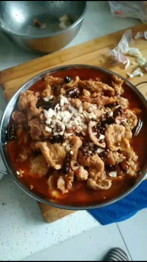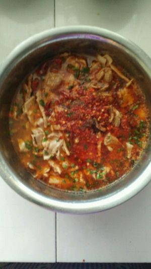 锅里放油小火倒下豆瓣姜蒜小米辣干辣椒花椒大葱炒香加上适量都水,烧开倒点酱油加点味精,其实现在放点花椒面在汤里要入味点, 尝一下汤都盐喂合适不。合适就放下肉片煮2到3分钟。起锅倒在白菜上面。