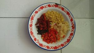 辣椒,麻花椒,下锅干煸一下,大蒜切碎~然后一起放到容器中间~