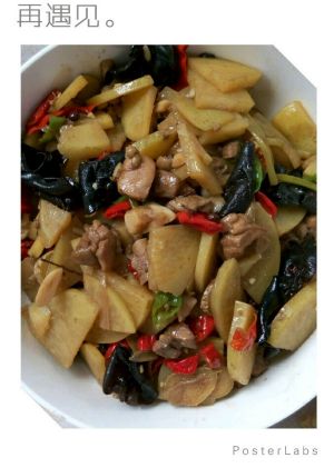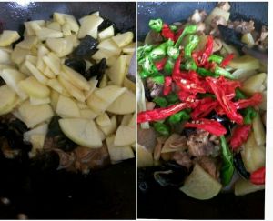 加土豆,木耳,翻炒。加水,焖一会儿。土豆变半透明,放辣椒,继续翻炒。熟了以后,放盐,鸡精,味精适量。(想吃绵软的土豆可以多焖一会儿)。