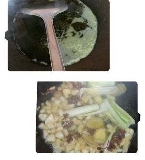 热锅放油,冒青烟时放入准备好的葱姜蒜等爆香。(有干辣椒,八角什么的也可以放,我怕太辣没放。看个人口味^_^)
