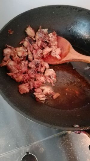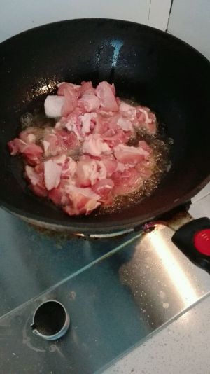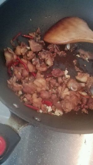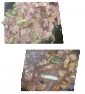 爆香之后,放入鸡块煸炒。变色后倒入料酒小汤勺,酱油一汤勺(可多放点,鸡肉入味),老抽适量。翻炒后加水过鸡肉,收汁到鸡肉2/3,鸡肉入味。