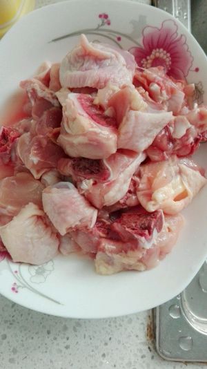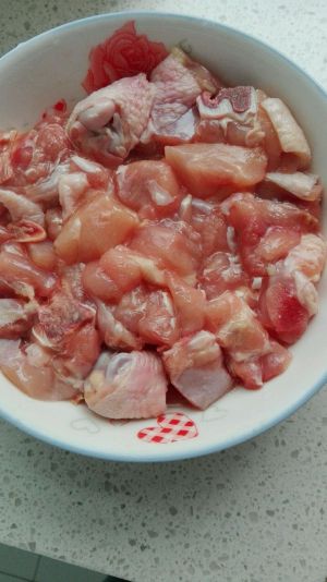 鸡腿肉切块,然后清水洗净。我是带骨头一起做的,感觉带骨头更有味。也可以剔骨