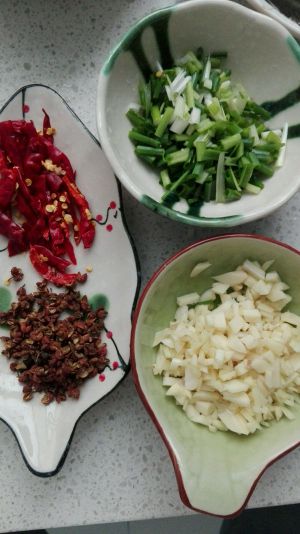 干辣椒泡水,姜蒜切片,葱切段,青椒切段,我用的藤椒,直接从冰箱里拿出来解冻