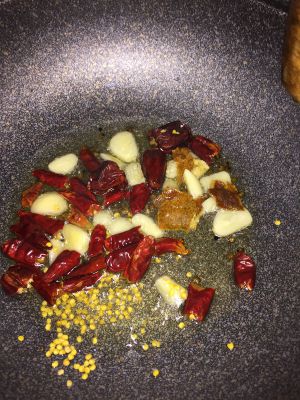 锅里放少量油把辣椒段,葱姜,芝麻,花椒放入锅中煸炒炒出香味