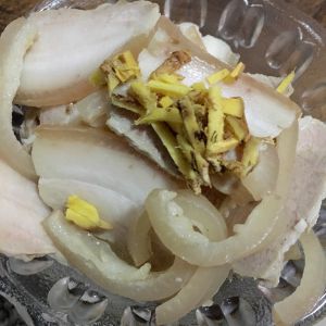 五花肉切片,用生姜料酒抓匀腌制十五分钟