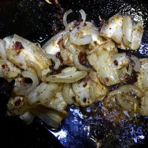 加入洋葱炒,加生抽两勺,盐适量,花椒粉适量,