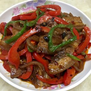 待肉片出油有点卷的时候,加入小青椒,炒至断青。