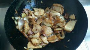 少放一点油,一会儿猪肉会出油。肉和姜丝放入锅中煸炒