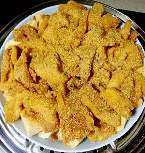 腌制好的肉裹上蒸肉粉,铺在红薯上,