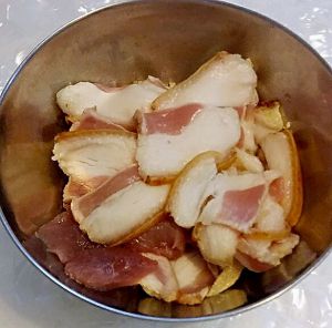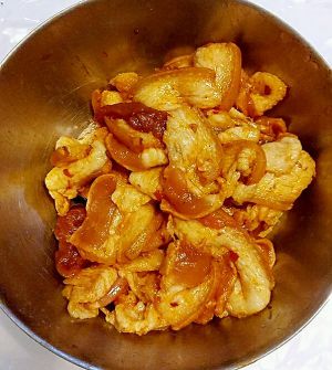 五花肉切块,用姜蒜末、红尖椒、盐、鸡精、豆瓣酱进行搅拌腌制。PS:具体的调料量根据食材多少定,没有具体限定。