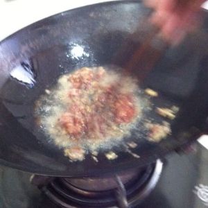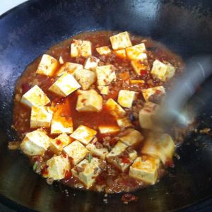 植物油下锅,把猪沫炒香,再加入蒜沫姜沫,然后放郫县豆瓣酱,生抽,老抽,少许盐,炒香,加豆腐块,加入两碗清水