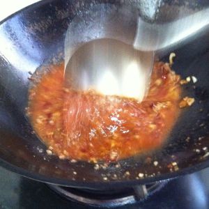 转小火,加入1匙半郫县辣酱炒出红油,倒入1匙半酱油,待酱油沸腾后,加入清水。