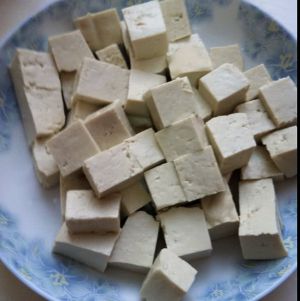 老豆腐冲洗后切块,开水焯一下,去豆腥味,豆腐也不易破损。