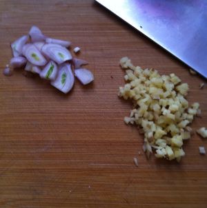 锅中倒入2汤匙花生油,将洋葱末倒入煸香,倒入蒜末煸香。