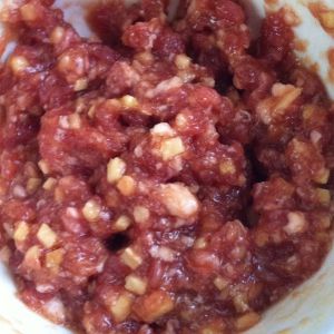 调制肉馅,放入姜沫,生抽,耗油,料酒,糖,搅拌均匀