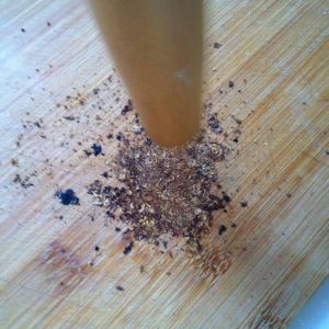 锅内花椒冒烟后,晾凉,放在菜板上,用擀面杖将其碾碎,备用