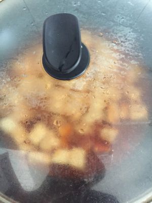 把豆腐放进去,盖上锅盖中火烧三到五分钟,为了让豆腐更入味。