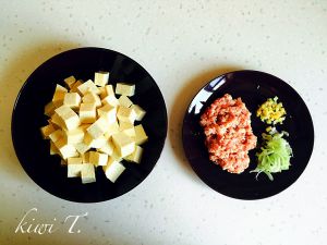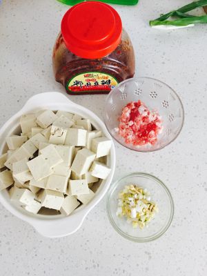 豆腐切方块,肉切末,葱姜蒜切末。