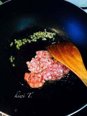 煸香后放入猪肉末。