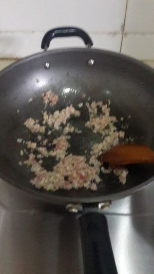 先放入姜和蒜炒香,倒入肉末小火煸炒。