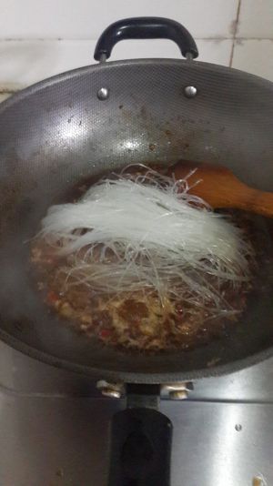 放两碗水煮粉丝,中途放盐,生抽,最后加入肉末翻炒,加点葱花装盘