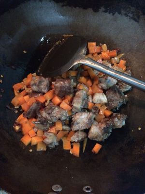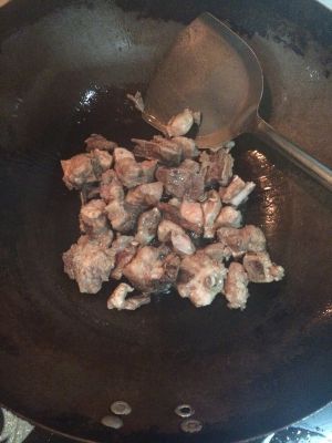 炒锅烧热食用油,爆香葱姜,倒入排骨翻炒至肉表面金黄。