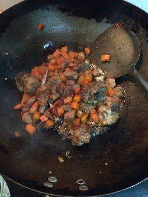 起锅倒油,放冰糖,炒糖色(我是水油炒出的糖色,凉油放冰糖,油和糖1比2,小火炒至冒泡泡,放一小碗热水,马上盖住锅盖,关火,尝一下糖的味道)