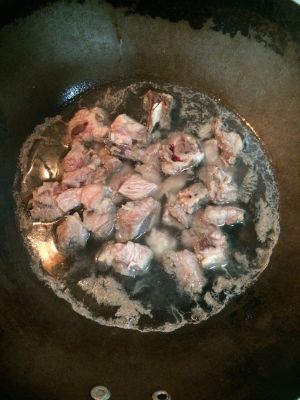 猪排倒入锅中,加清水,姜片,葱段,一勺料酒,烧开。