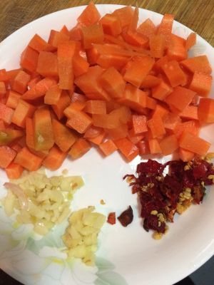 把材料准备好,蒜,姜剁成末……胡萝卜切丁……干辣椒切小块