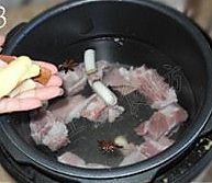 排骨放清水中洗净,沥去水。排骨放高压锅中,加适量水。 放入3段葱﹑2个八角﹑2瓣蒜﹑2片姜﹑2片桂皮。盖上盖子,用高压锅煮30~40分钟。 煮完,用勺子撇去浮沫。