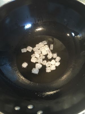 排骨紧好了捞出沥干。锅中放油下冰糖,小火熬化。切记小火,不然就糊了,吃起来会有苦味。