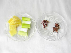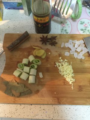 准备好这些调料:葱切段,姜切丝,蒜拍碎或者切末。准备好冰糖、香叶、大料、桂皮还有红烧汁