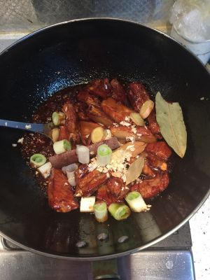 加葱姜蒜、桂皮、大料、香叶翻炒。